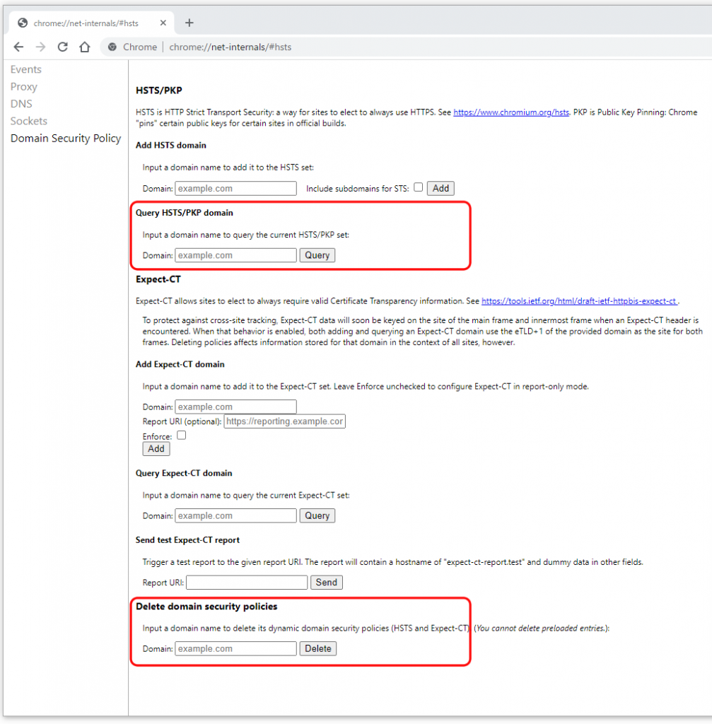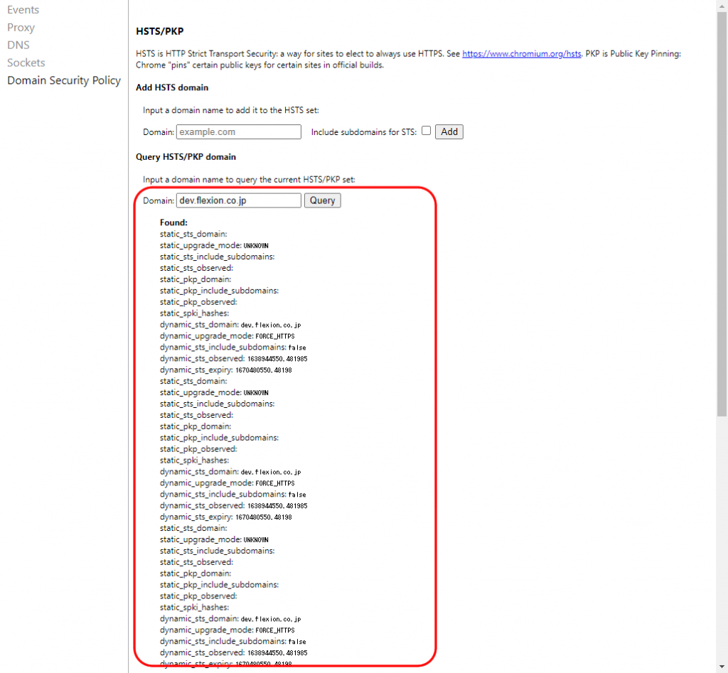 「Query HSTS/PKP domain」 のところで、HSTS(強制アクセスするやつ) を使うドメインとして登録されているか確認する。