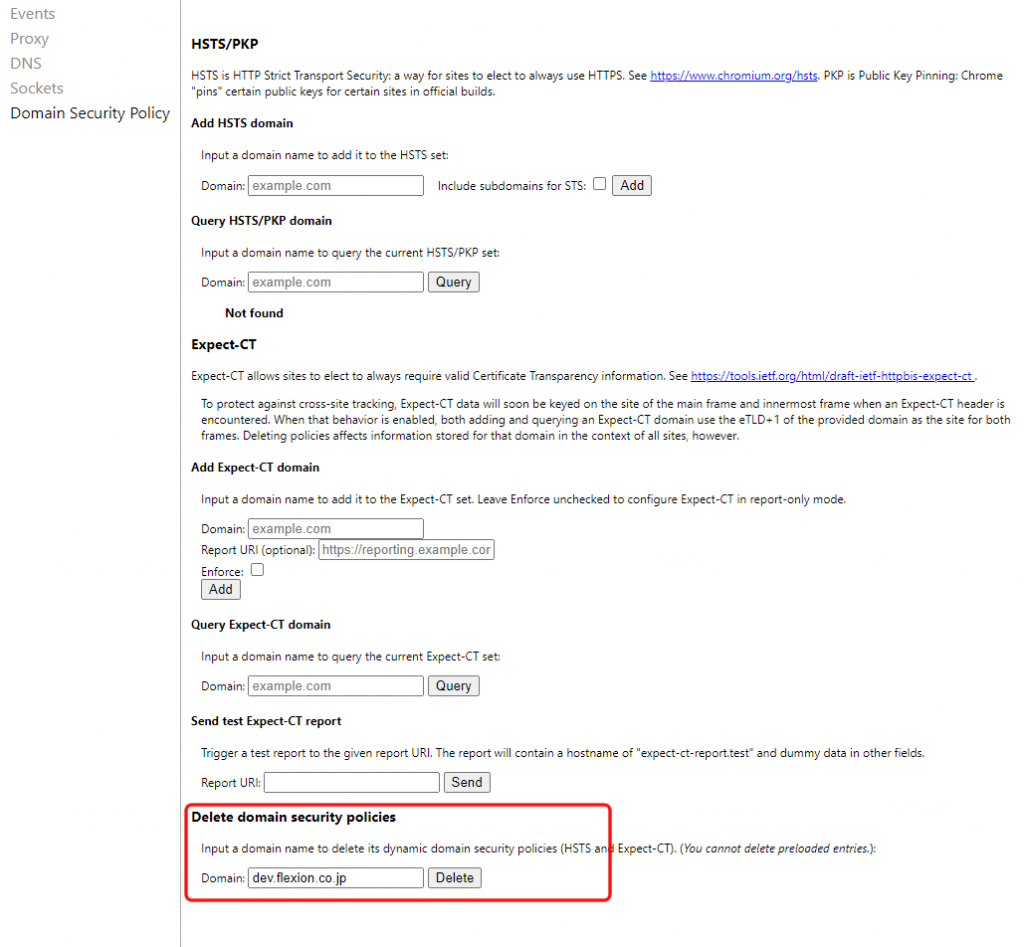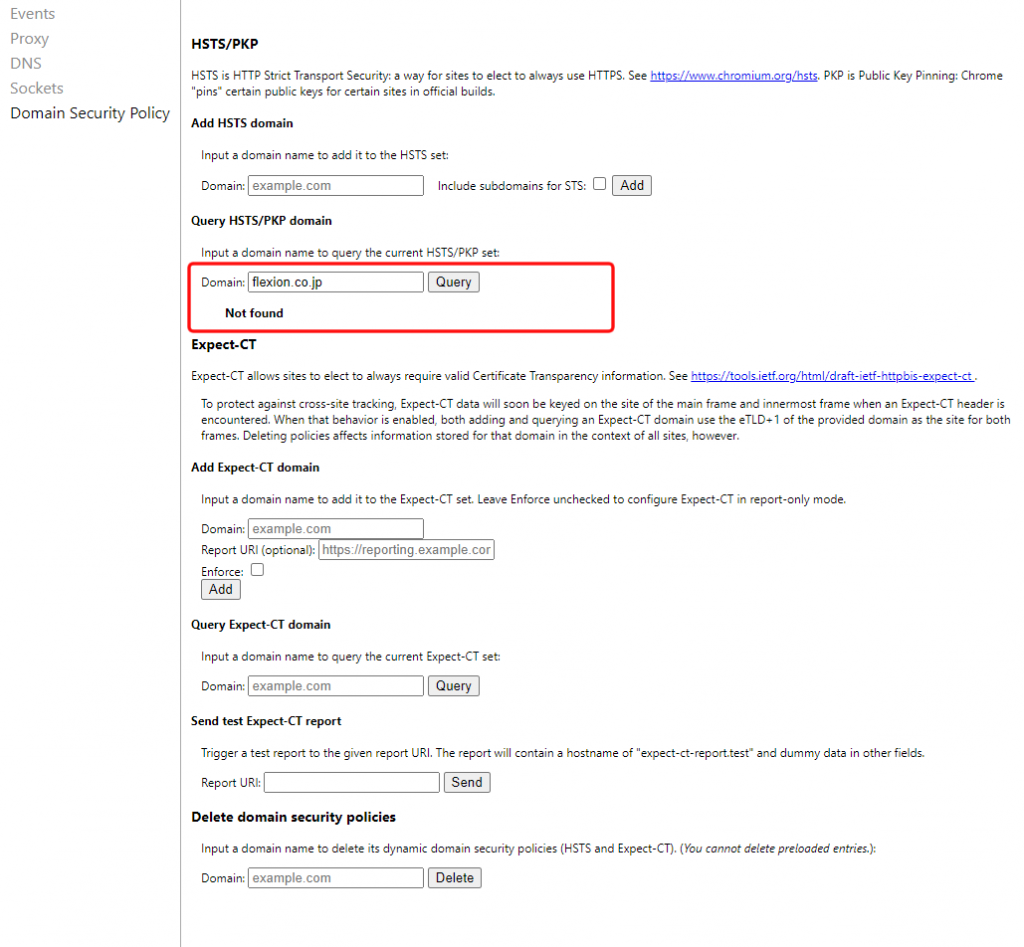 設定(ドメイン削除)ができているかどうかは、もう一度 1)「Query HSTS/PKP domain」 のところで、ドメインが 登録されていないことを確認します。(Not FoundになればOK)