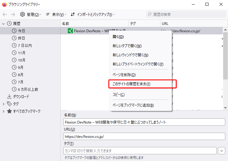2) ドメイン履歴を右クリックし、[このサイトの履歴を消去] を選択します。
